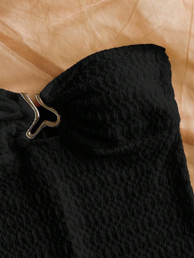 This women's black romper features a strapless, backless design with a twist and ring detail, creating an elegant yet casual look perfect for summer vacations or holiday parties. Crafted from a knitted fabric blend of 93% polyester and 7% elastane, it offers medium stretch for a fitted, skinny silhouette. The semi-sheer unitard is sleeveless with a natural mid-waistline and short length, combining comfort and style. Care instructions recommend hand washing without dry cleaning to maintain fabric quality. Ideal for adding a chic statement to your daily wear or special occasions.