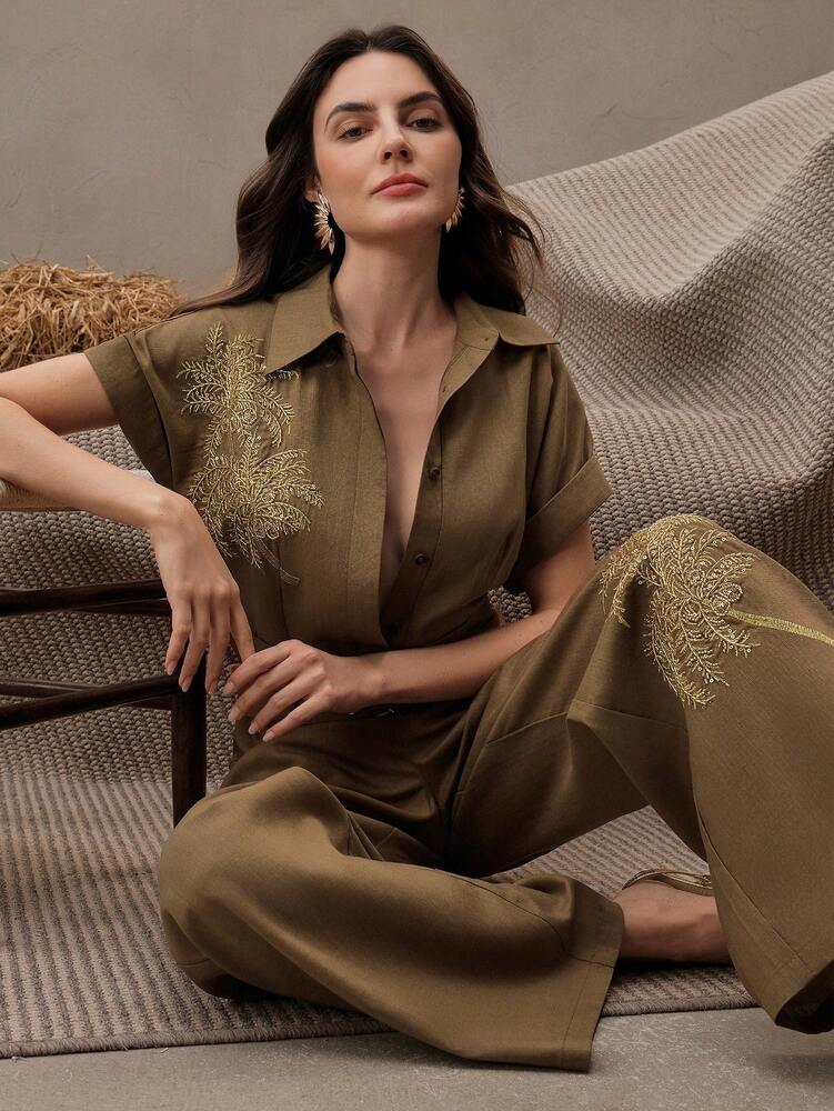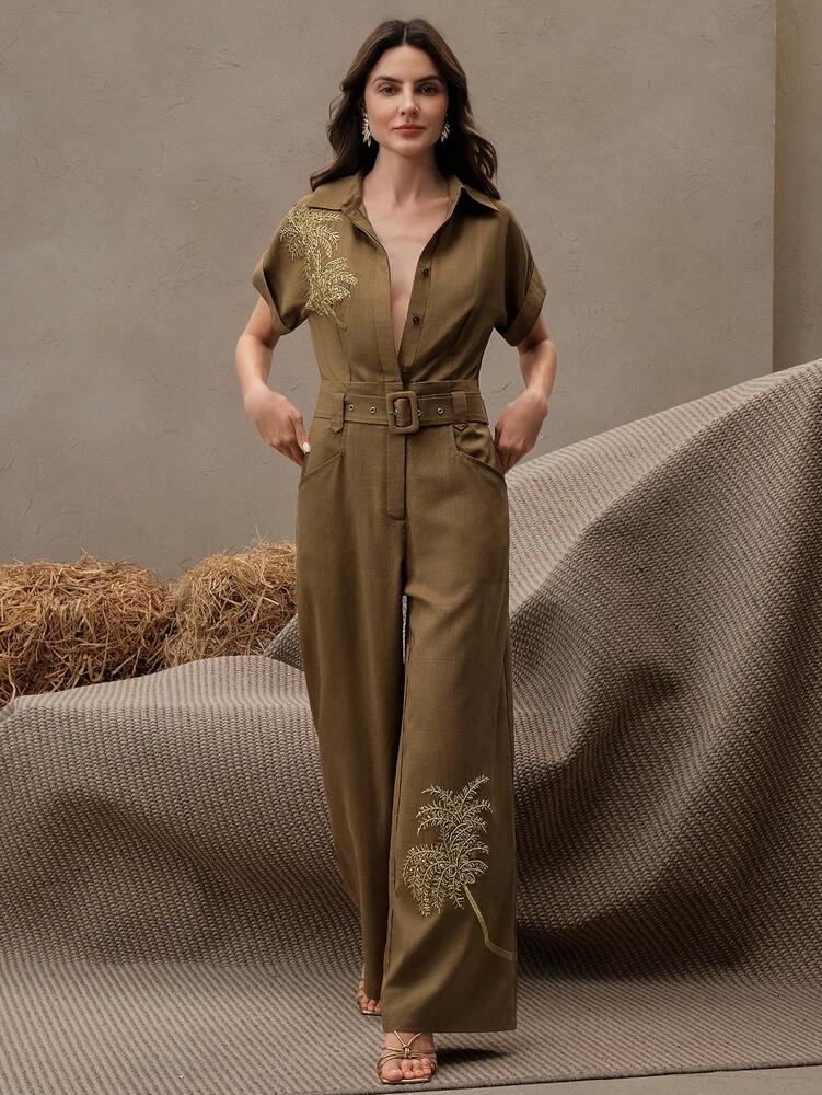 Women's Green Embroidered Jumpsuit Short Sleeve With Belt Coconut Tree Design Elegant Vacation Festival Outfit Summer Party Holiday Wear