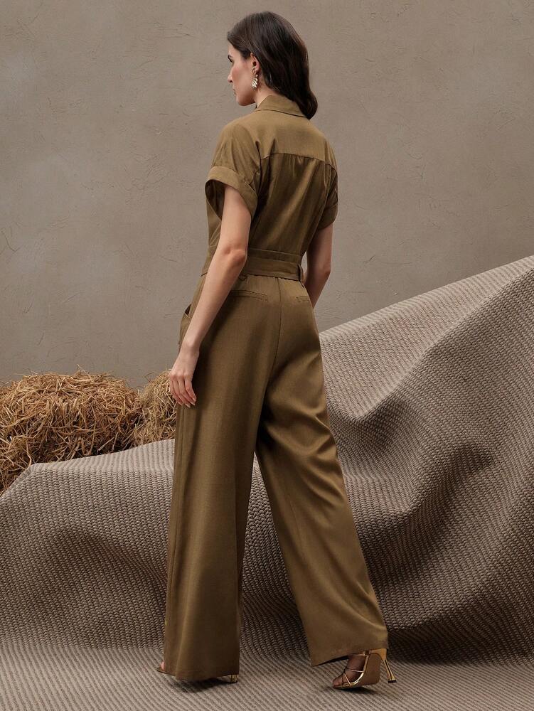 This elegant women's jumpsuit features a high waist and a button-front design for refined detail. Crafted from breathable, non-stretch woven lyocell fabric, it ensures comfort and durability. The short batwing sleeves and loose fit provide ease of movement, while the extra-long length creates a flattering silhouette. Ideal for Ramadan, Eid al-Fitr, Id al-Adha, or summer festivals, it combines casual style with sophisticated elements for a versatile holiday outfit. Hand wash only to maintain its quality and vibrant look.